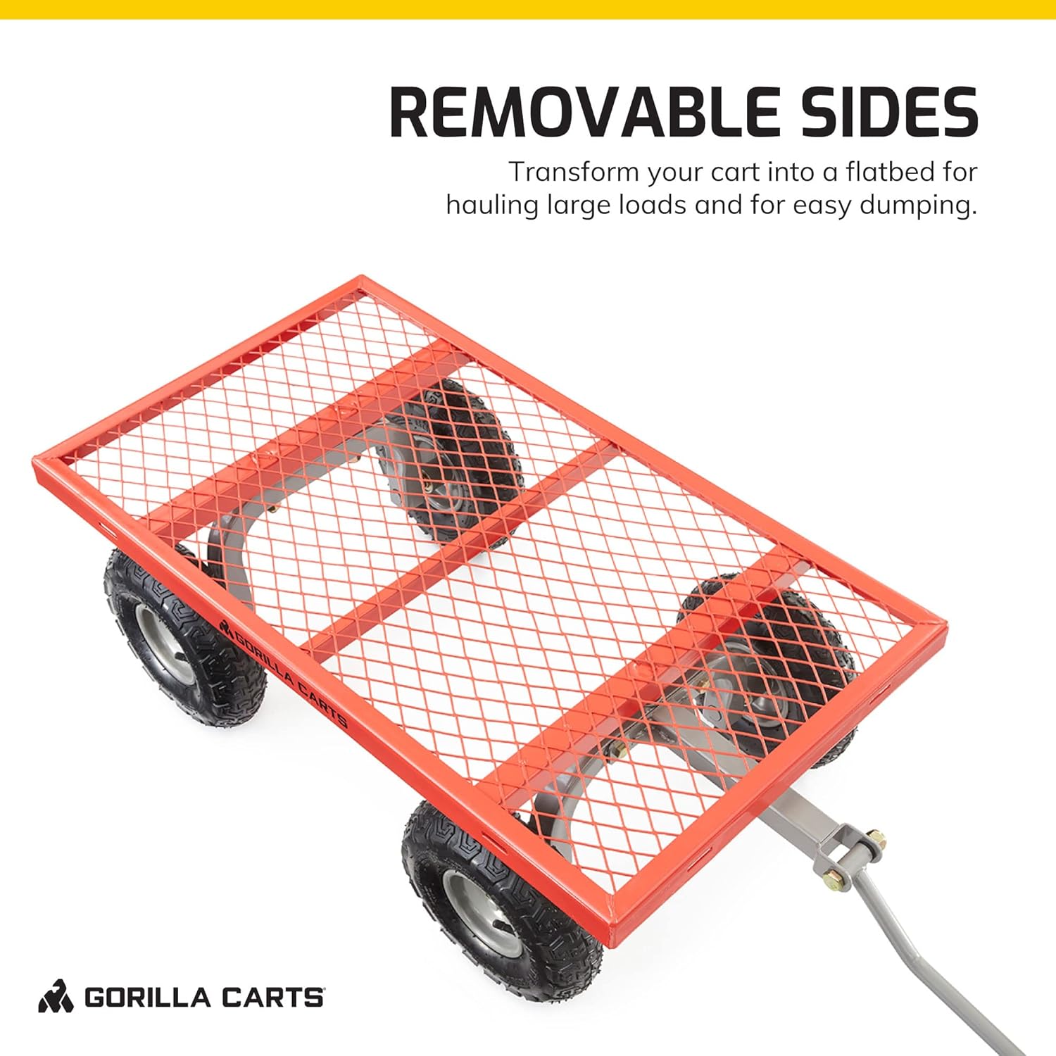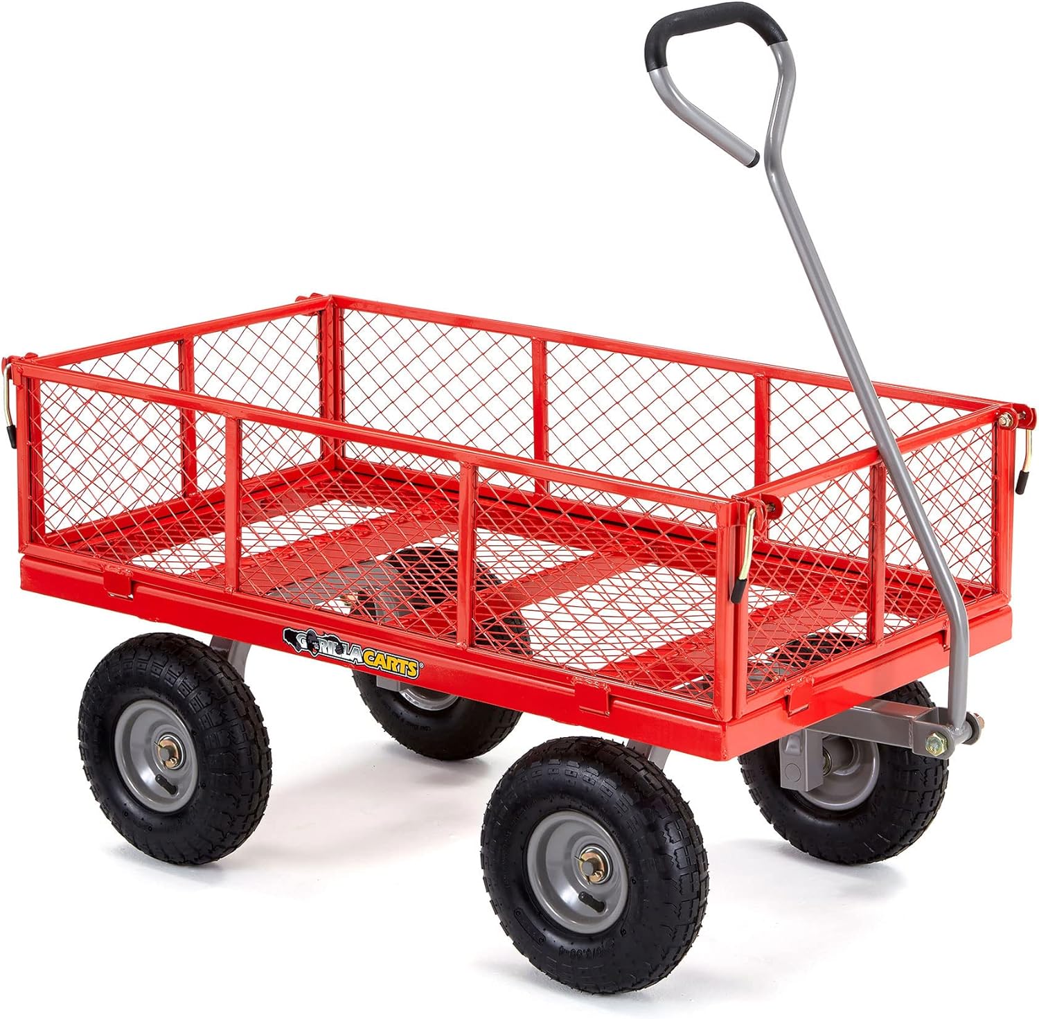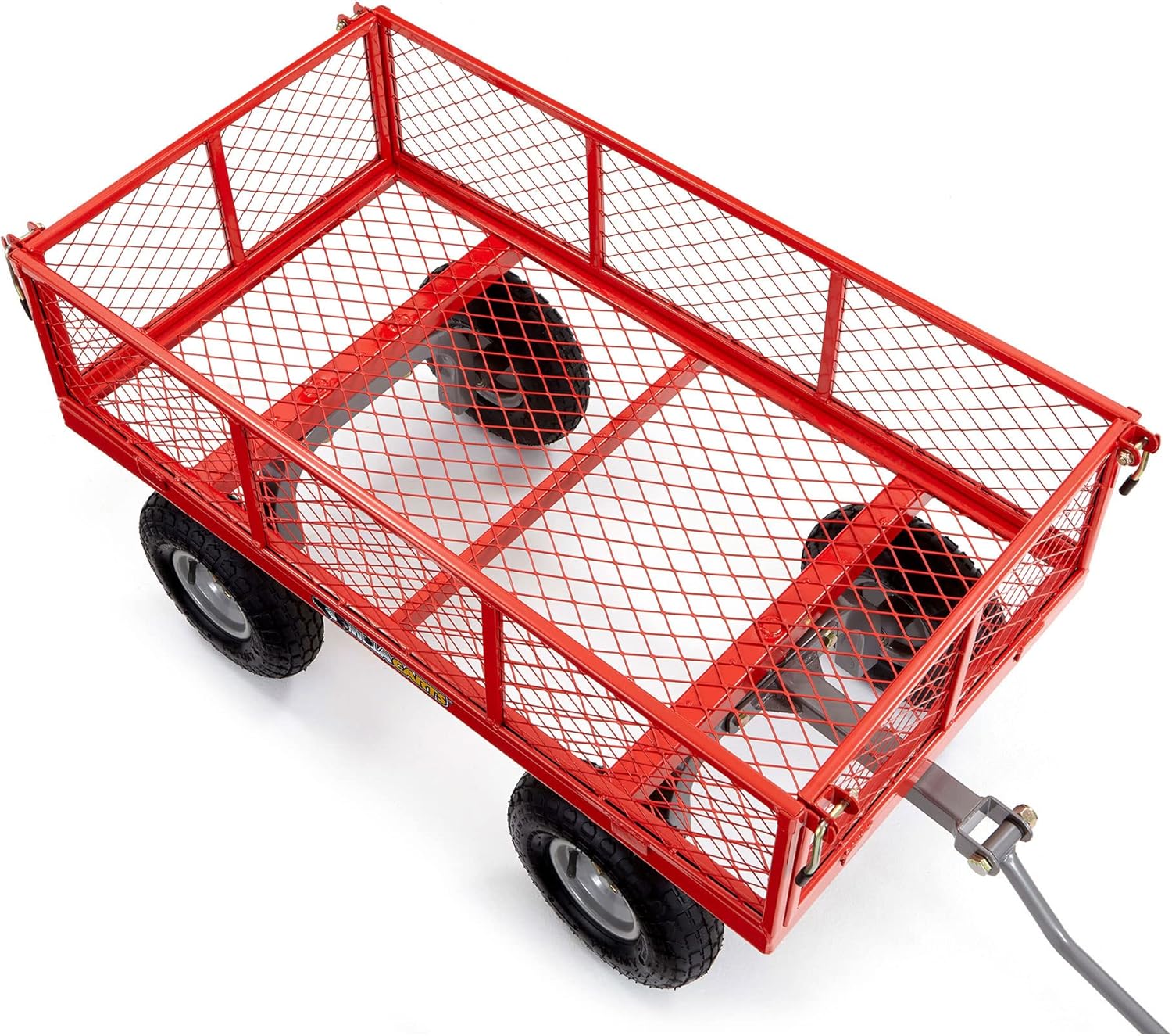 | Heavy-Duty Capacity: This yard cart is built to handle up to 800 pounds, making it perfect for hauling farm tools, garden equipment, and transporting materials. Versatile Use: The 4-wheel garden cart serves as a utility wagon, beach wagon, and lawn cart, providing multifunctional use for various outdoor tasks and activities. Robust Design: Featuring a 38 by 20.86-inch mesh bed and a sturdy steel frame, this pull-behind cart ensures durability and long-lasting performance. Smooth Maneuverability: Equipped with 10-inch pneumatic tires, the cart navigates effortlessly across diverse terrains, from grass to sand. The handle allows you to easily maneuver tight turns. Removable Sides: Ideal for carrying larger loads, the tow-behind utility cart has removable side panels, converting the gardening wagon into a flatbed cart. |