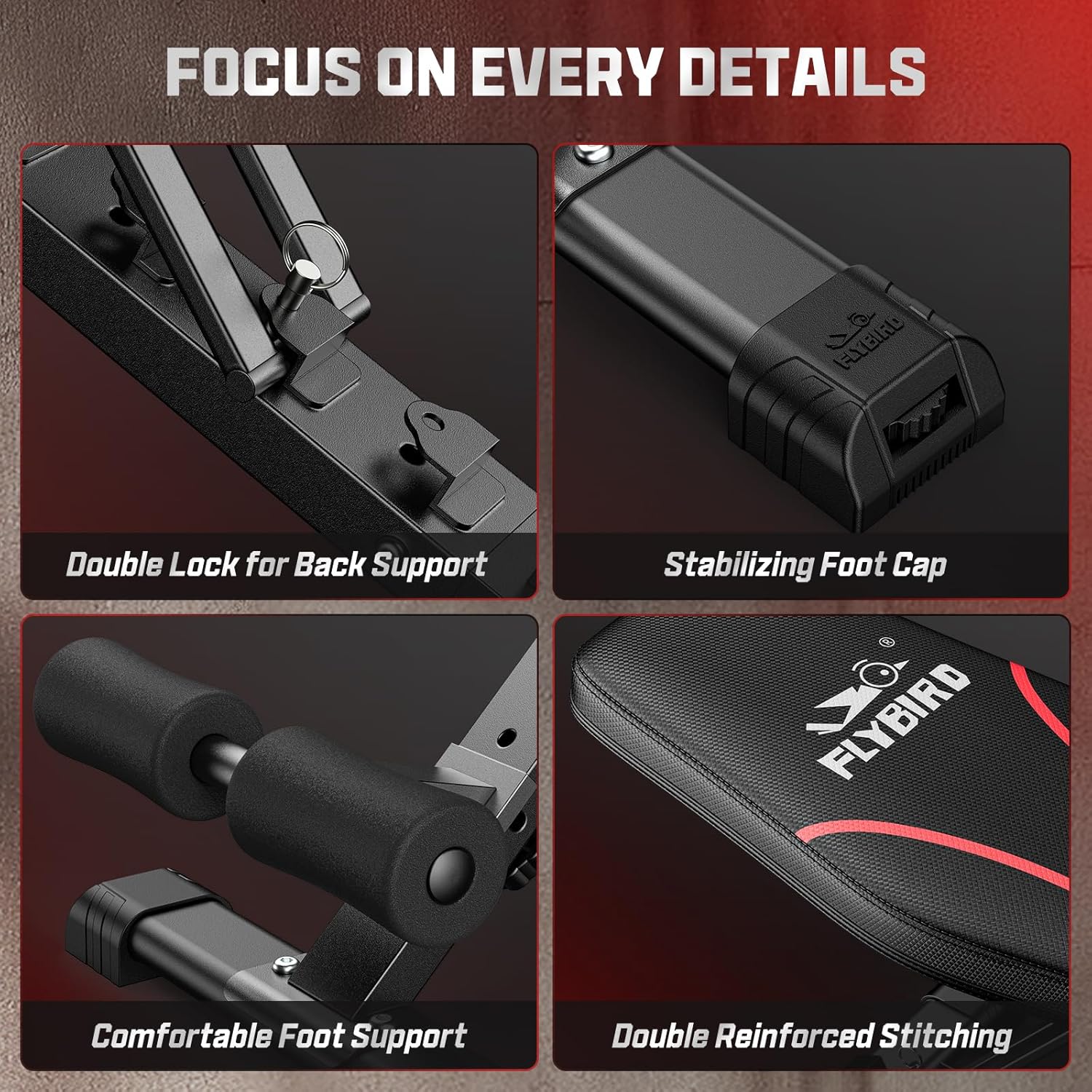 | High-Quality Bench: Built from commercial-grade steel, this bench has passed thousands of weight tests to ensure workout safety every time. Fashion Adjustable Bench: Featuring a unique triangle structure, this heavy-duty, commercial-quality steel bench provides a safe fitness experience with a 600 lbs weight capacity, ensuring stability. Fast and Simple Adjustments: Designed with 6 back positions and 4 seat positions for a full-body workout. Simply pull the support bar, adjust to your desired position, and you're all set. High Cost-Effective Bench: Includes a 9.7" wide backrest with a 1.8" thick pad filled with soft foam and made of high-quality leather, suitable for users up to 5.9". An excellent choice for beginners. Space-Saving Design: The foldable bench is easy to carry and requires no assembly. It folds down to 31.5" L x 12.6" W x 11.8" H, making it easy to store in a corner, closet, or under the bed when not in use. |