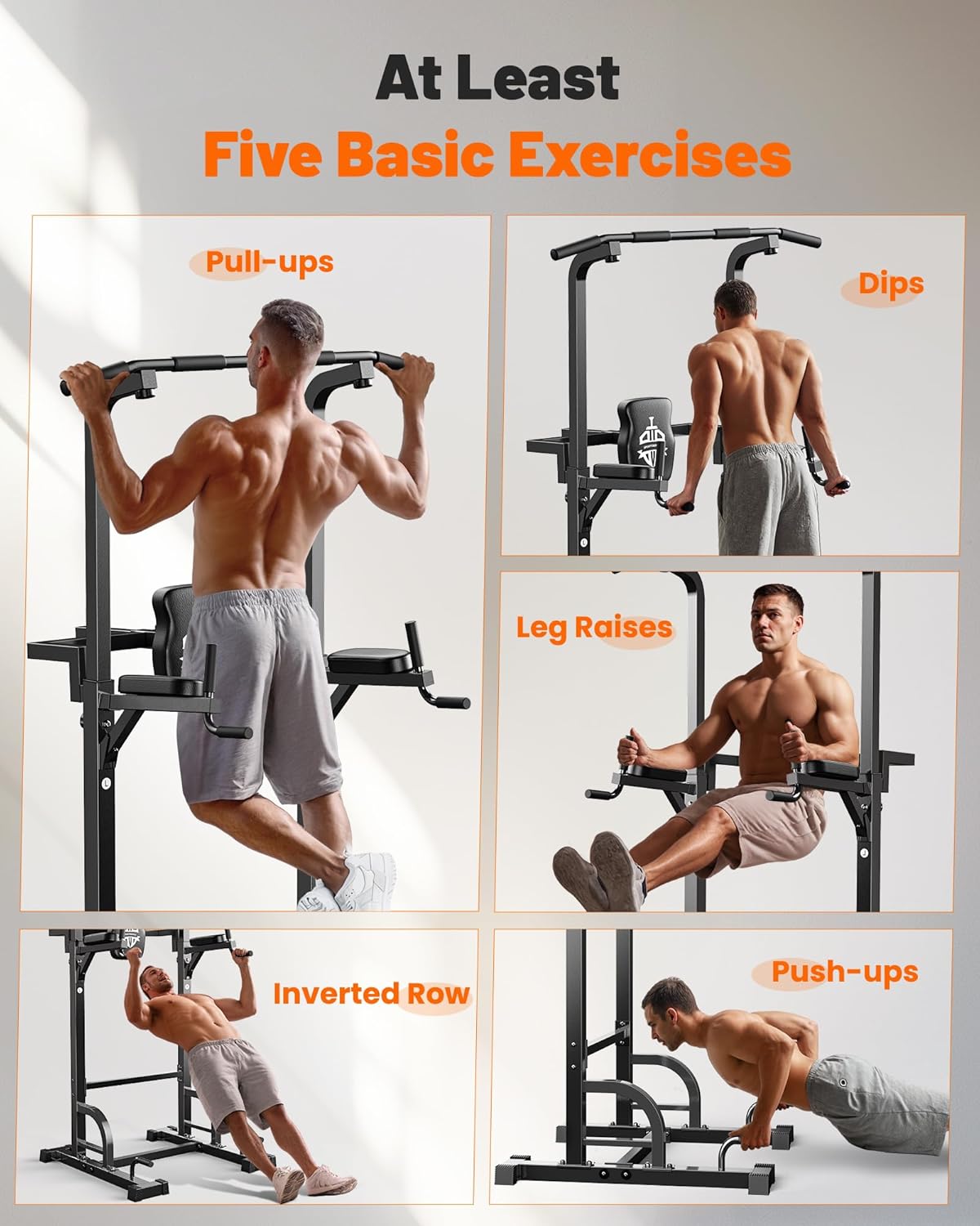 | Super Sturdiness and Stability: With a weight capacity of 450lbs, you can feel secure during intense workouts. Whether performing pull-ups, dips, knee raises, or other exercises, the Power Tower remains steady without wobbling, ensuring a safe and effective session. Variety of Exercises: From classic pull-ups and chin-ups to challenging dips and leg raises, it caters to various strength training needs. This multifunctional design is a fantastic all-in-one solution for targeting different muscle groups and achieving a full-body workout. Powerful Adaptability: The pull-up bar offers a comfortable grip and allows for various hand positions, targeting different muscle areas. This adaptability keeps your workouts fresh and engaging. Designed for Comfort: The 10-degree reclined position, padded armrests, and backrest add an extra level of comfort during exercises like dips, making the experience enjoyable and less strenuous on your joints. The 6 adjustable heights and 7-position adjustable backrest meet the workout needs of the whole family. Space-Efficient Machine: Its compact design is a bonus for home gyms with limited space, making it a practical addition to any home gym, garage, or workout area. Easy Assembly: Clear instructions and well-labeled parts make the assembly process smooth and hassle-free. Set it up quickly and start your workout immediately. Highly Durable Functionality: Built with solid steel and premium materials, the Power Tower guarantees long-lasting durability. It withstands regular use without signs of wear and tear, standing up admirably to your demanding workout routine. |